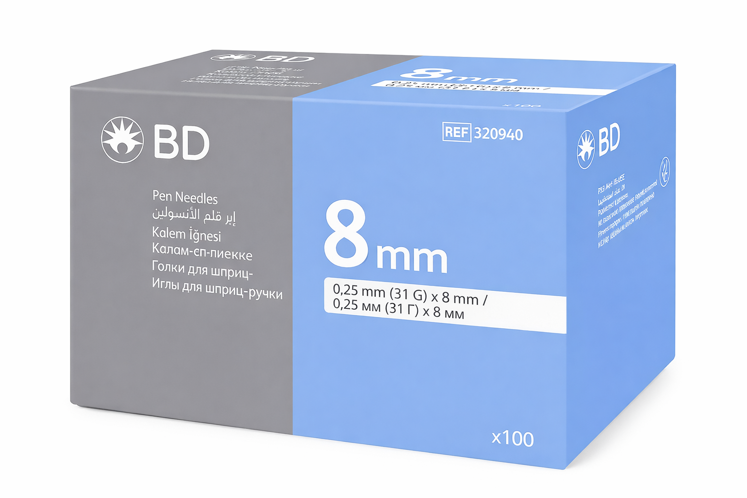 BD İnsülin Kalem İğnesi 31G 0,25 x 8 mm 100'lü. İdeal uygulama derinliği ve emilim güvenliği arayan kalem kullanıcıları için tasarlanmış yüksek konforlu profesyonel uç; acıyı minimize eden 31G ince yapı ve güvenli subkutan iletim sağlayan 8 mm uygulama derinliğiyle her türlü insülin kalemiyle sızdırmaz uyum sağlayan steril, tek kullanımlık kalem iğnesi.