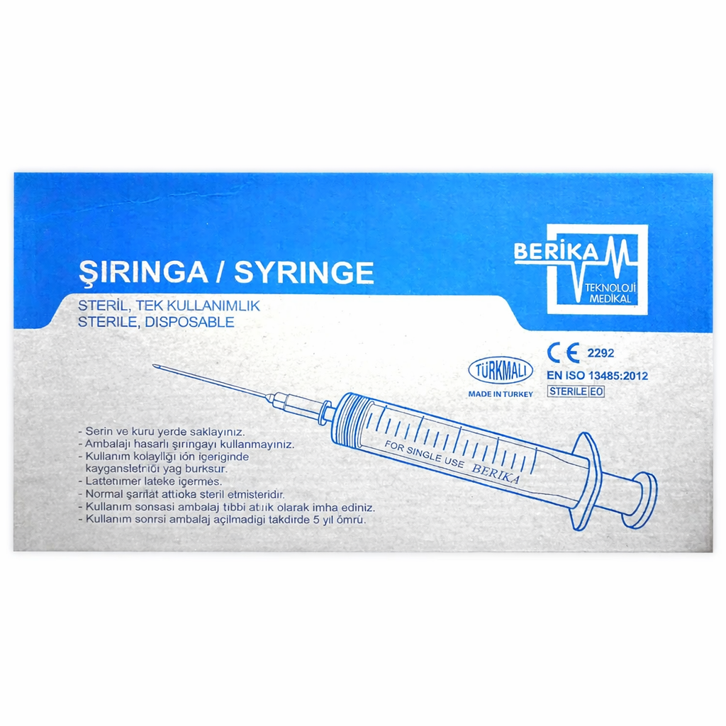 Berika Enjektör 5 cc 3 Parça Yeşil - 250'li Kutu. Hastaneler ve klinikler için özel olarak paketlenmiş 250'li avantajlı koli; kas içi enjeksiyonlar ve sıvı çekimi için ideal 21G (yeşil) iğne ucu, sızdırmaz 3 parçalı kauçuk contasıyla pürüzsüz ilaç transferi sağlayan, steril ve tek kullanımlık standart medikal sarf malzemesi.