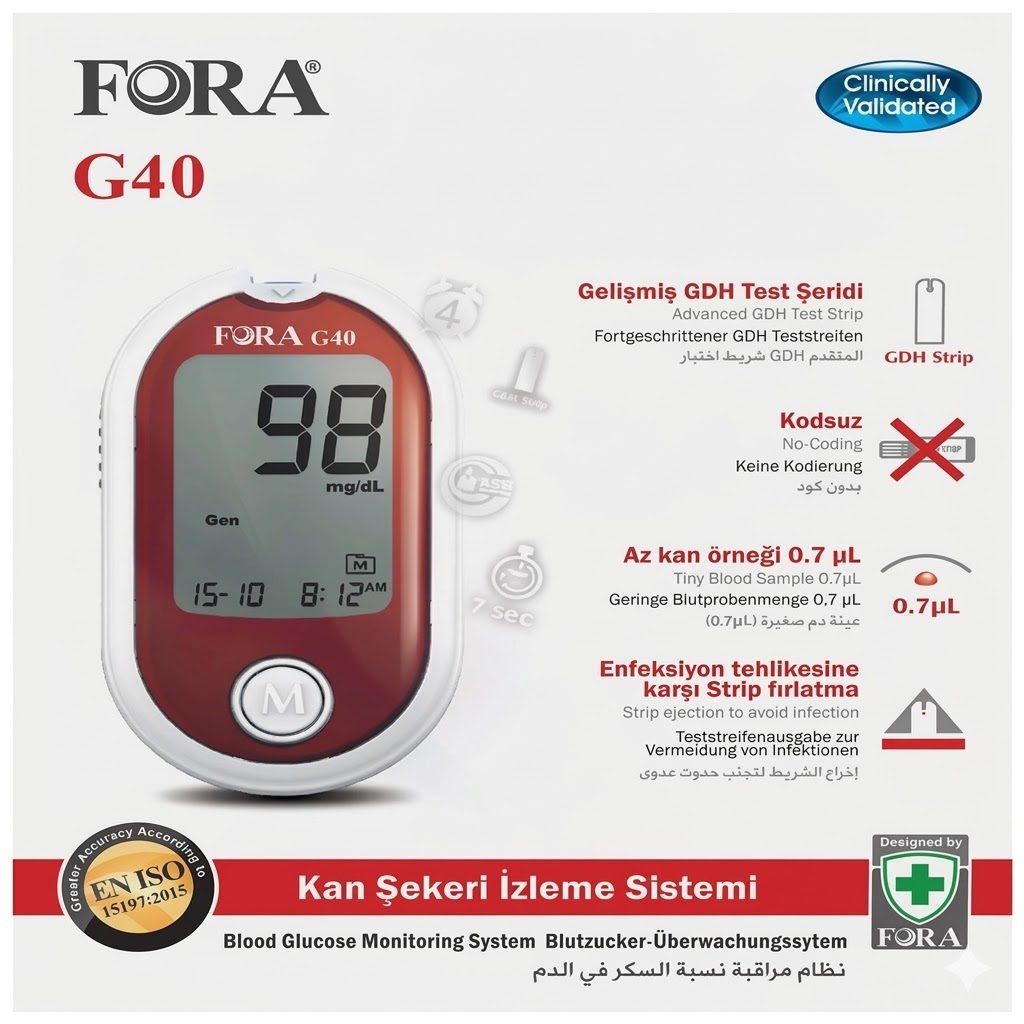 Fora G40 Kan Şekeri Ölçüm Cihazı Seti, diyabet hastalarının günlük glukoz seviyelerini en doğru, en hızlı ve en zahmetsiz şekilde izleyebilmeleri için kompakt ve ileri teknoloji ile donatılmış bir sistemdir.
