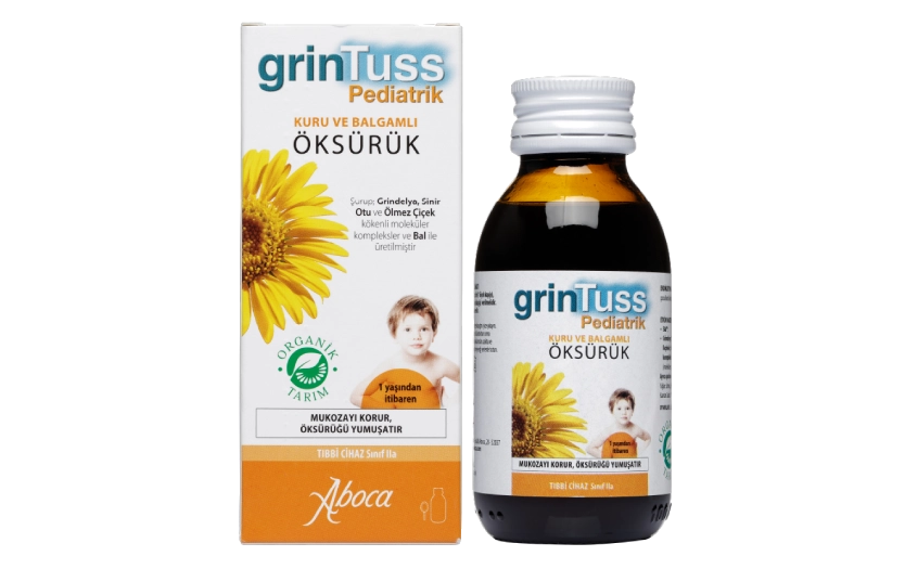 Grintuss Pediatrik, çocuklarda öksürük tedavisi için tamamen doğal ve organik tarım ürünlerinden elde edilmiş yenilikçi bir şuruptur. Öksürüğü merkezi sinir sistemini baskılayarak değil, boğaz mukozasını koruyarak ve nemlendirerek fizyolojik yoldan hafifletir. Sentetik madde içermeyen bu akıllı formül; kuru öksürükte mukozayı tahrişe karşı koruyan bir film tabakası oluşturur, balgamlı öksürükte ise mukusun nemlenmesini sağlayarak vücuttan atılmasını kolaylaştırır.