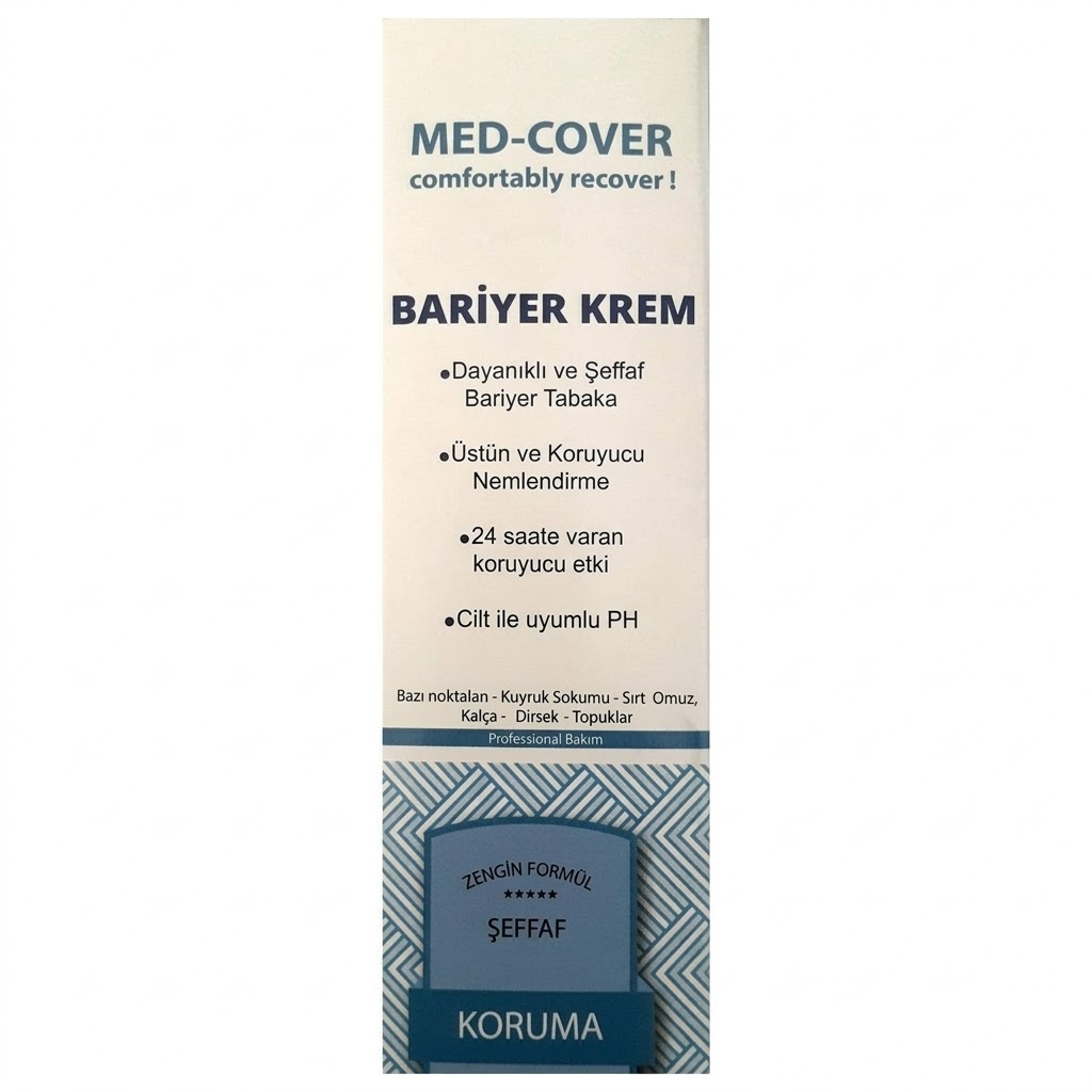 Med-Cover Bariyer Krem, cildi nem kaybına ve dış irritanlara (vücut sıvıları, ter, nem) karşı korumak için özel olarak formüle edilmiş, durulama gerektirmeyen profesyonel bir cilt koruma ürünüdür.
