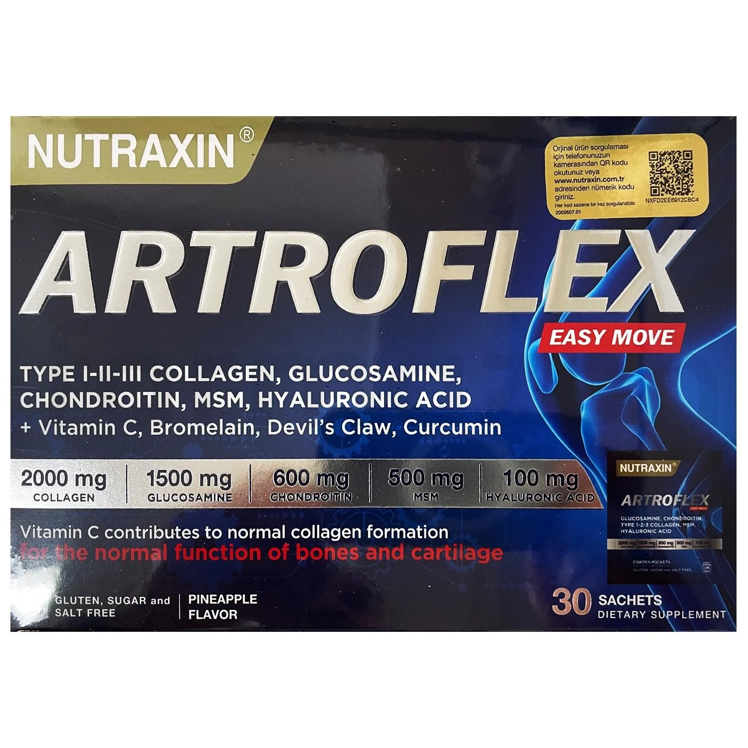 Nutraxin Artroflex Easy Move 30 Saşe. Glukozamin, Kondroitin, MSM ve 3 farklı Kolajen tipini (Tip I-II-III) tek şasede sunan; Hyaluronik Asit, C Vitamini ve bitkisel ekstrelerle güçlendirilmiş, ananas aromalı ve şekersiz takviye edici gıda.