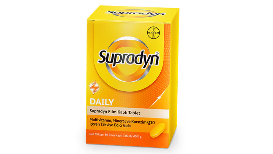 Supradyn Daily, günümüzün yoğun ve stresli yaşam temposunda vücudun ihtiyaç duyduğu ekstra enerjiyi ve direnci sağlamak için formüle edilmiş yeni nesil bir multivitamindir. Formülünü sıradan vitaminlerden ayıran en önemli özellik, hücresel enerji üretiminin temel taşı olan "Koenzim Q10" (CoQ10) içermesidir. Özel B vitamini kompleksi ve C vitamini ile zenginleştirilen bu içerik, normal enerji oluşum metabolizmasını destekleyerek halsizlik, yorgunluk ve tükenmişlik hissini ortadan kaldırmaya yardımcı olur. Günde sadece 1 tablet ile bağışıklık sisteminizin normal fonksiyonunu korurken, güne çok daha zinde ve aktif devam etmenizi sağlar.